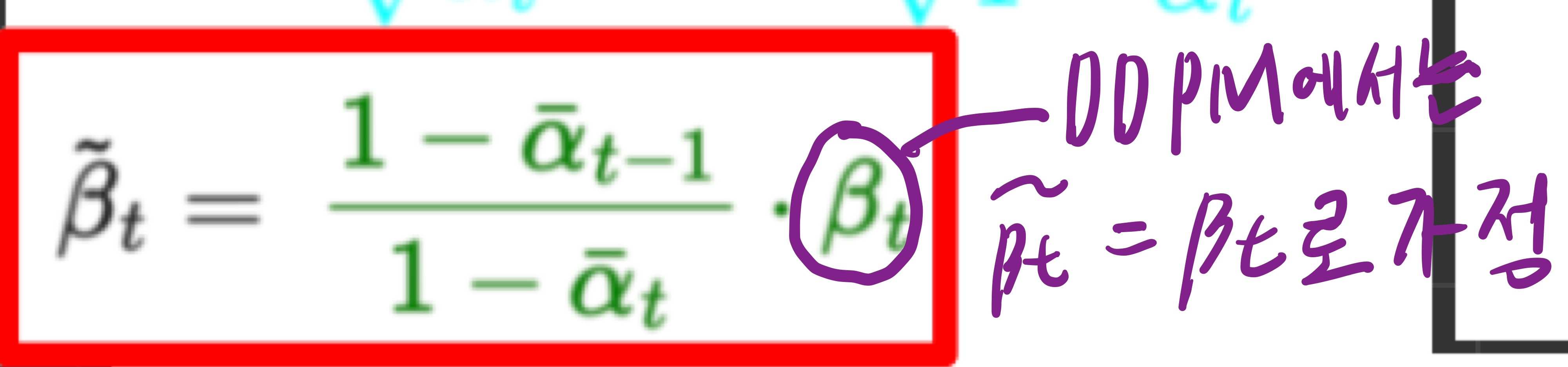 - 참고로 βt~은 q(xt−1∣xt,x0) normal distribution의 variance로써, DDPM에서 아래 수식과 같이 유도했습니다.