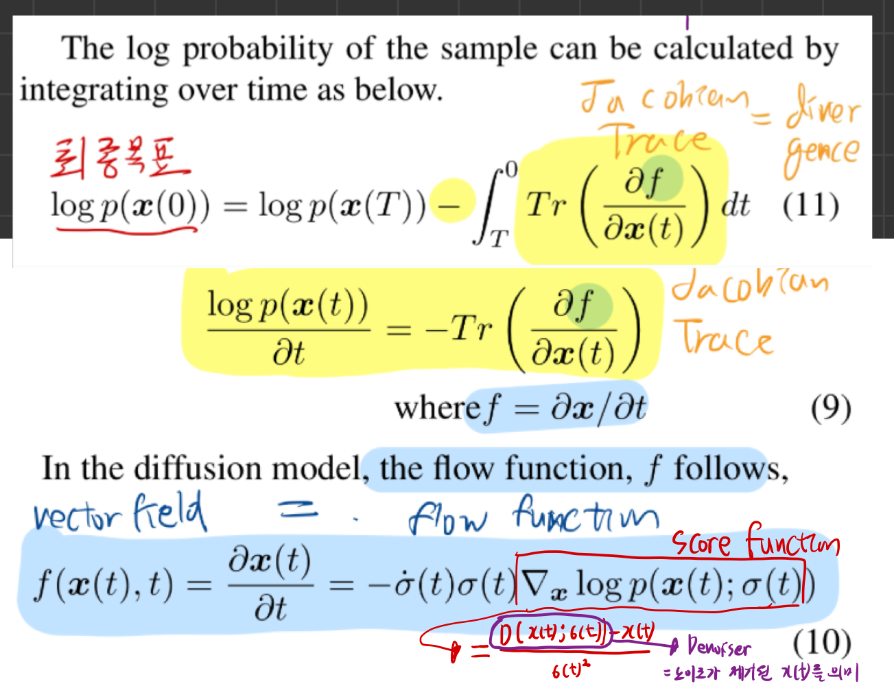 또한, 논문에서 제시한 정확한 샘플 로그 확률 계산(Exact log probability inference) ( logp(x(0)) ) 을 하려면, 역확산 샘플링 과정에서 매 step 야코비안(Jacobian)의 트레이스(trace)를 계산하는 과정이 필요합니다.