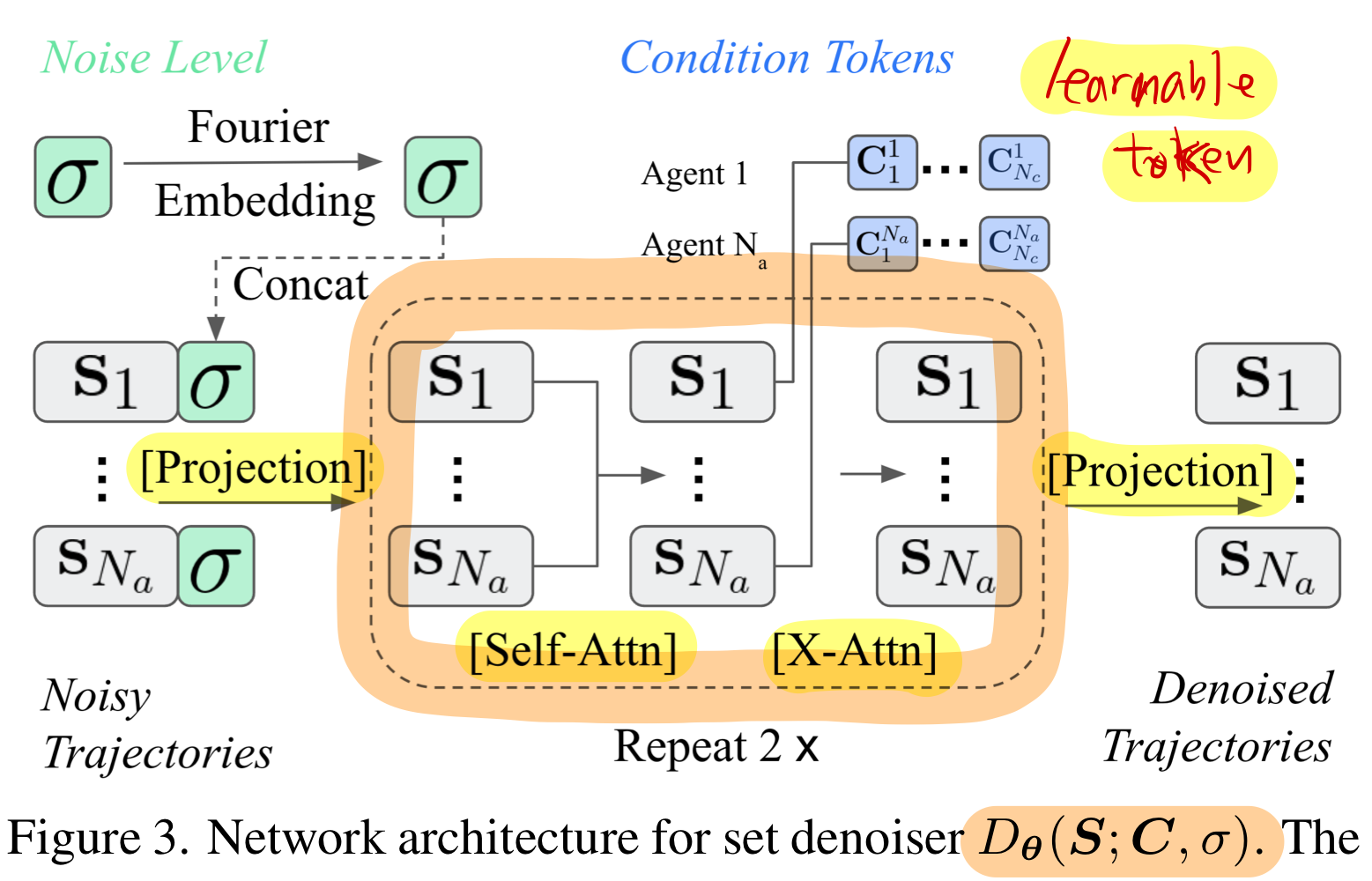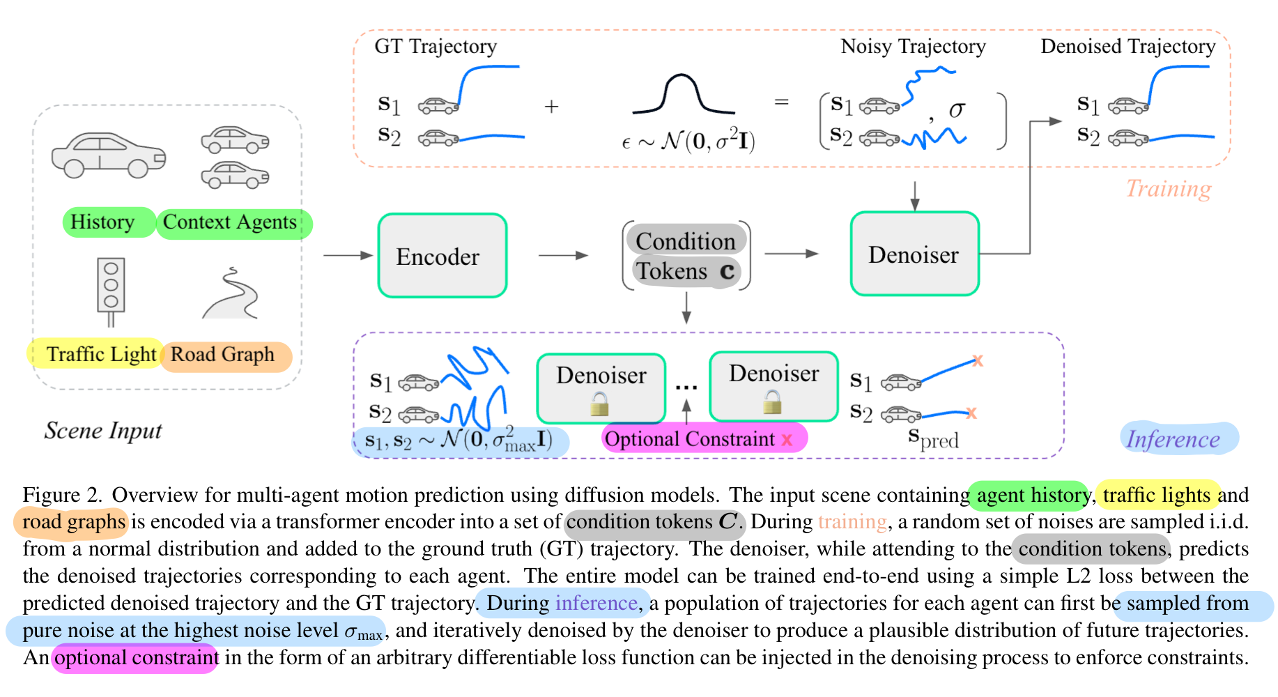 여기서 디노이저(denoiser)는 확산 모델에서 “노이즈가 섞인 상태에서 원본(미래 궤적)을 복원”하는 역할을 합니다.