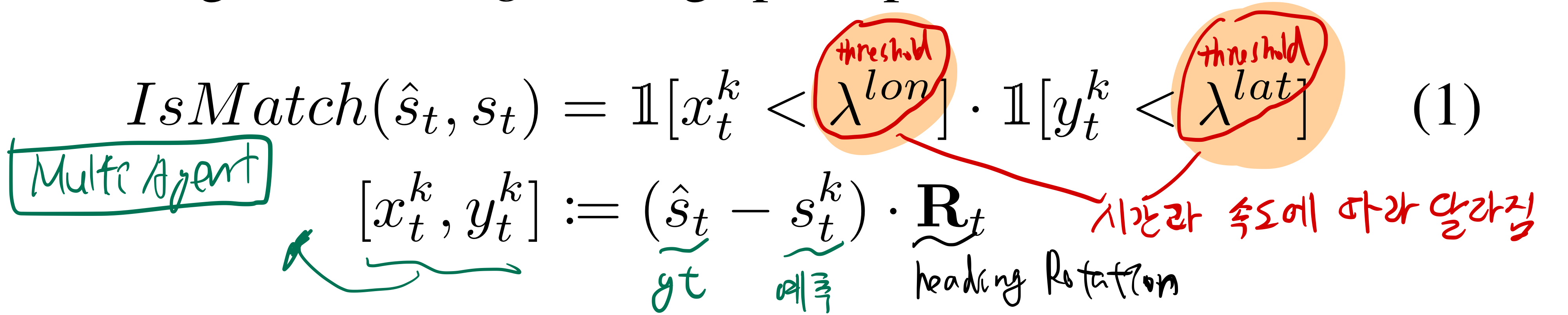 IsMATCH(st^,st): 시간 t의 각 waypoint에 대해, (모든 A마리 agent가) match인지 miss인지 표시하는 binary 값 (정답 궤적 위치와 가까운지 아닌지 판단)