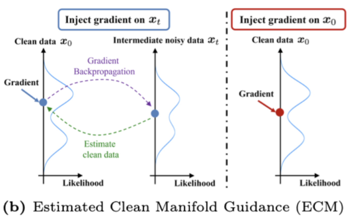 - Estimated Clean Manifold Guidance (ECM)은 가이던스 샘플링을 아래 2가지 목표를 동시에 만족하는 문제로 본다.