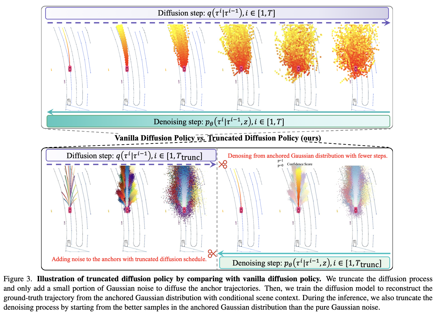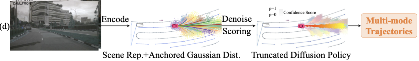anchored Gaussian distribution으로부터 시작해서, multi-mode driving action distribution로의 디노이징을 학습할 수 있습니다.
