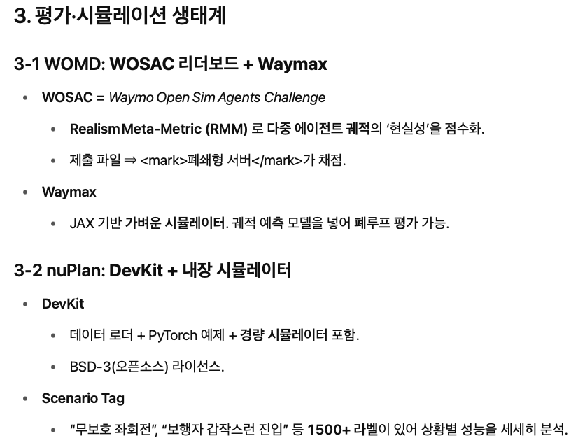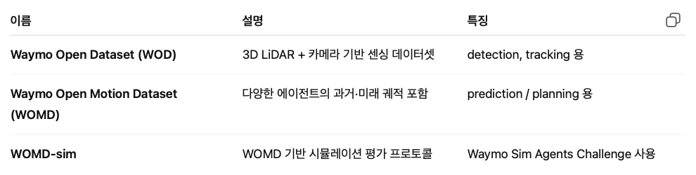 | 센서·주석 | WOMD v1.2.1 | nuPlan |