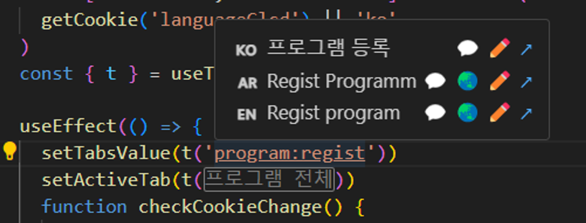2. 클릭, hover하면 이런식으로 내가 설정한 언어 key-value가 보인다.