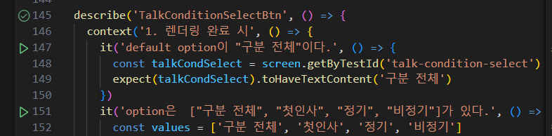 이런식으로 왼쪽의 버튼을 클릭하면 바로 특정 테스트를 실행시킬 수 있다.