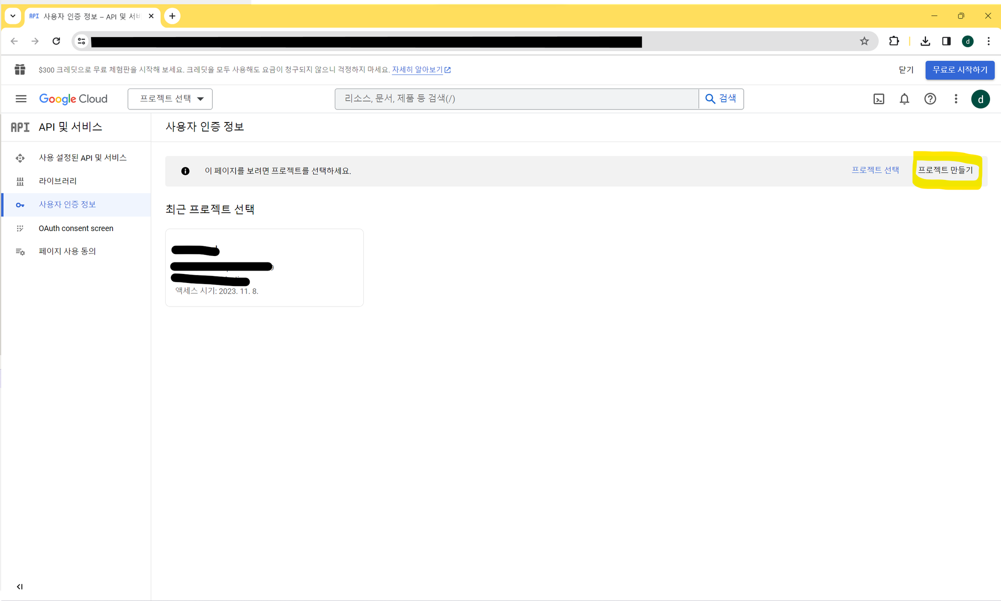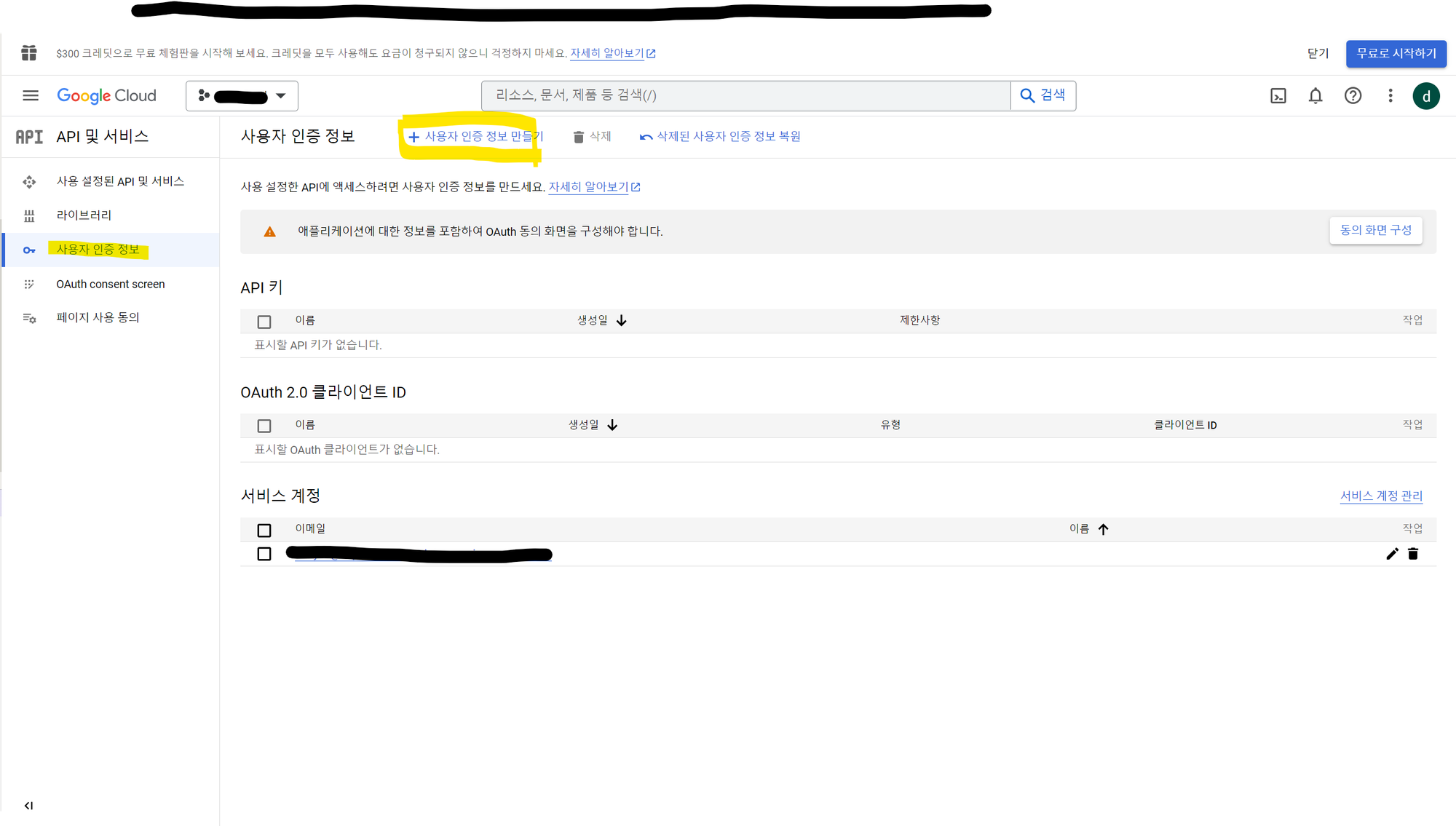 프로젝트 선택 후 사용자 인증 정보 > 사용자 인증 정보 만들기를 클릭.