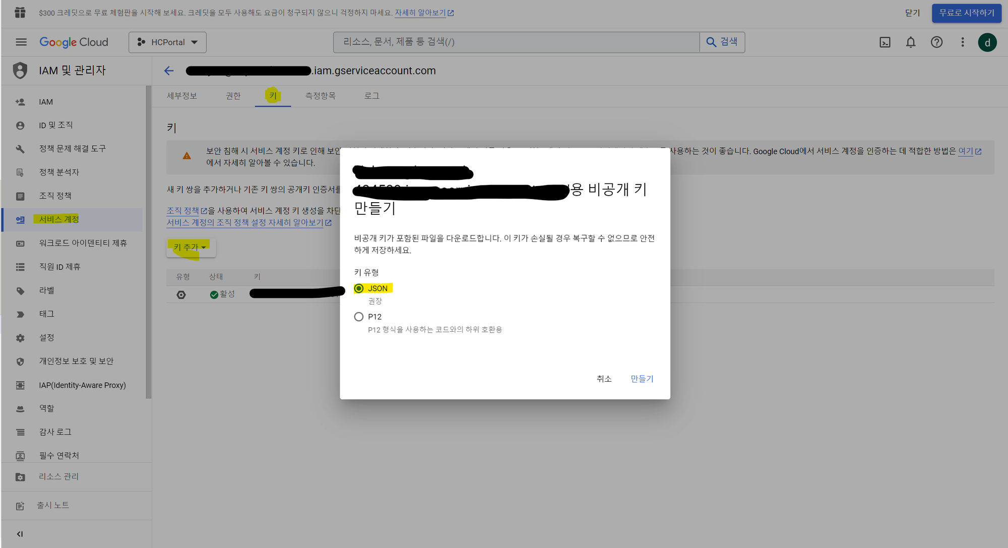 서비스 계정 클릭 > 키 추가 클릭 > 새 키 만들기 클릭