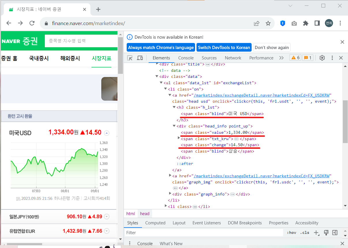 이런식으로 파싱해서 미국 환전 환율의 상단의 '미국USD'와 환율 금액, 상승 기호, 변동금액까지 출력해보자.