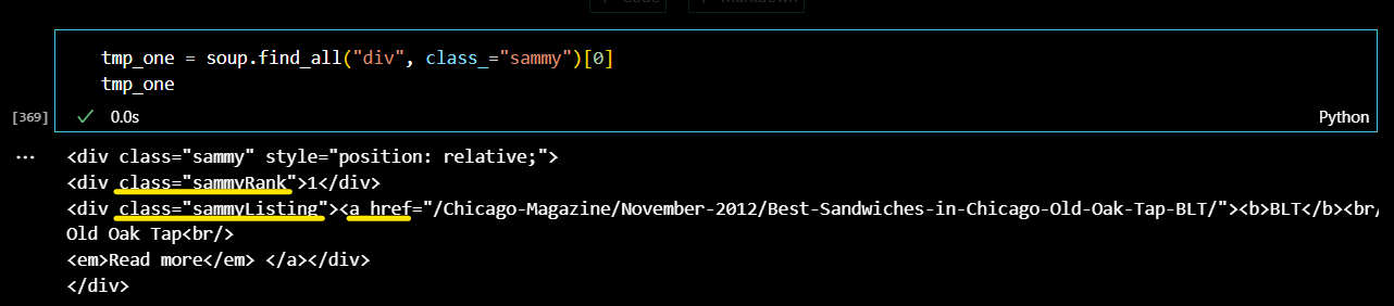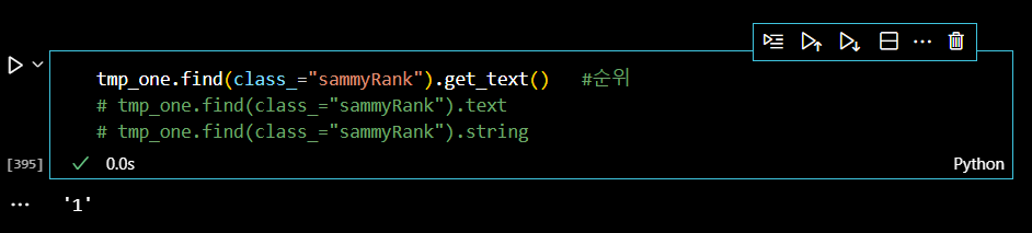 참고로 이번에는 select(),select_one() 메서드를 이용해서 파싱하는데, find()와 마찬가지로 태그를 인자로 집어넣으면 태그 안에 든 데이터를 출력한다. 하지만 select()의 경우에는 select()로 검색하면 모든 태그를 전부 찾고, select_one()을 이용해야 첫 번째 발견한 하나의 태그만을 찾을 수 있다. 이제 메서드를 이용해서 데이터를 찾아보자.