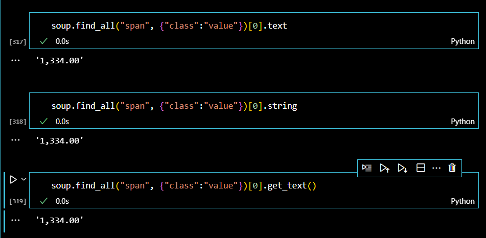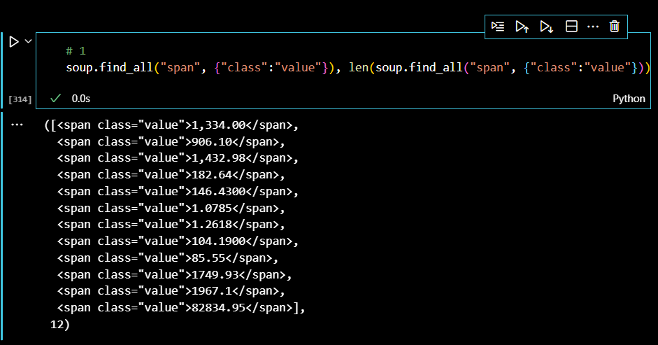 이때 태그가 span임을 확인했으므로, 모든 금액 데이터를 출력해보자.