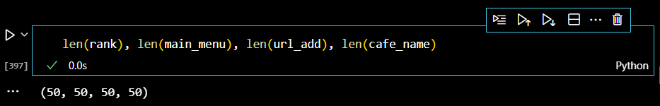 이런 식으로 for문을 활용해서 50개 맛집 정보를 모두 찾아보자. 메인페이지와 비슷한 방식으로 모두 리스트에 저장하되, 이번에는 tqdm패키지를 설치한다음 이를 이용했다.