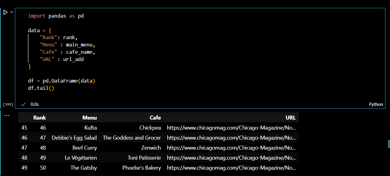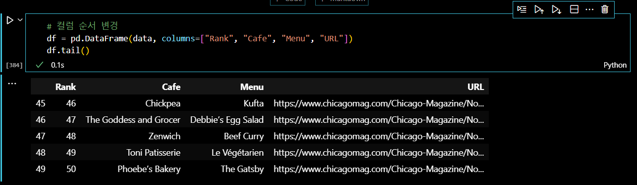 먼저, 메인 페이지를 통해서 50개 맛집의 순위, 메뉴, 카페 이름, 링크주소를 찾아내자. 분석에 사용할 라이브러리를 불러오고, url 주소를 변수에 지정한다.
