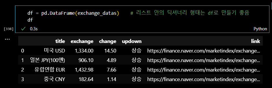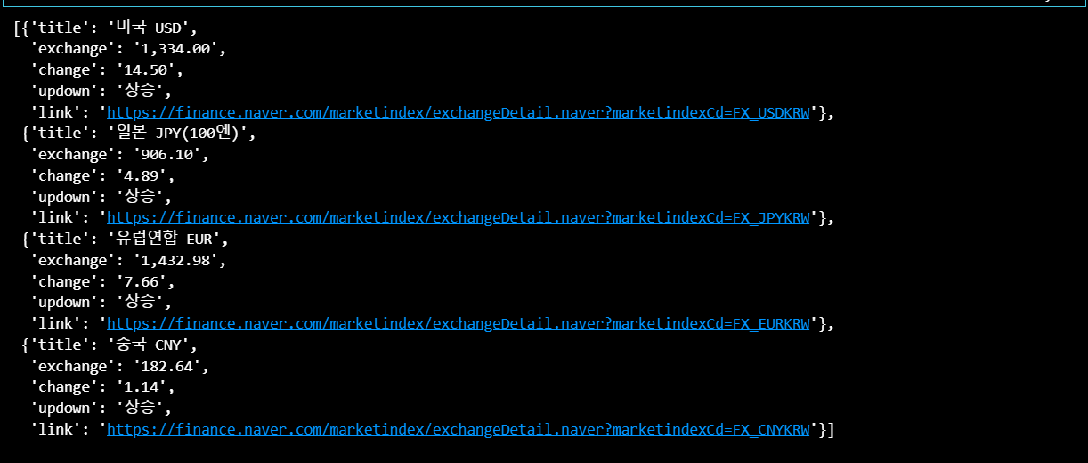 미국 환율정보를 불러오는 방법으로 for문을 사용해서 4개 국가의 모든 정보를 불러오자. 각 국가별 데이터는 리스트 안에 담고, 리스트를 딕셔너리 형태로 묶어서 변수에 지정해주었다.
