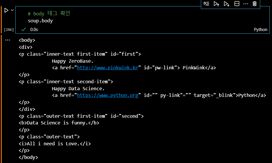 이제 불러온 웹페이지의 html 코드를 soup 변수에 지정했으면 태그를 불러오면 그 태그안에 든 내용을 확인할 수 있다. body태그와 p태그를 확인해보자.