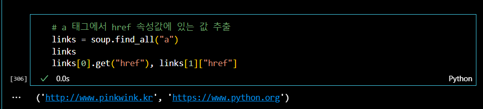 마지막으로 zerobase 웹페이지에 있는 링크들을 찾아보자. 링크는 <a href>를 통해서 생성되기 때문에, 먼저 a태그를 찾은 다음, href속성값을 검색한다.