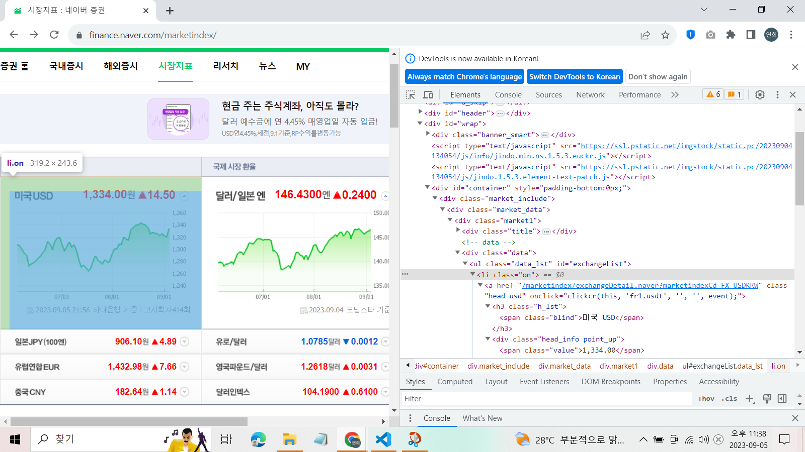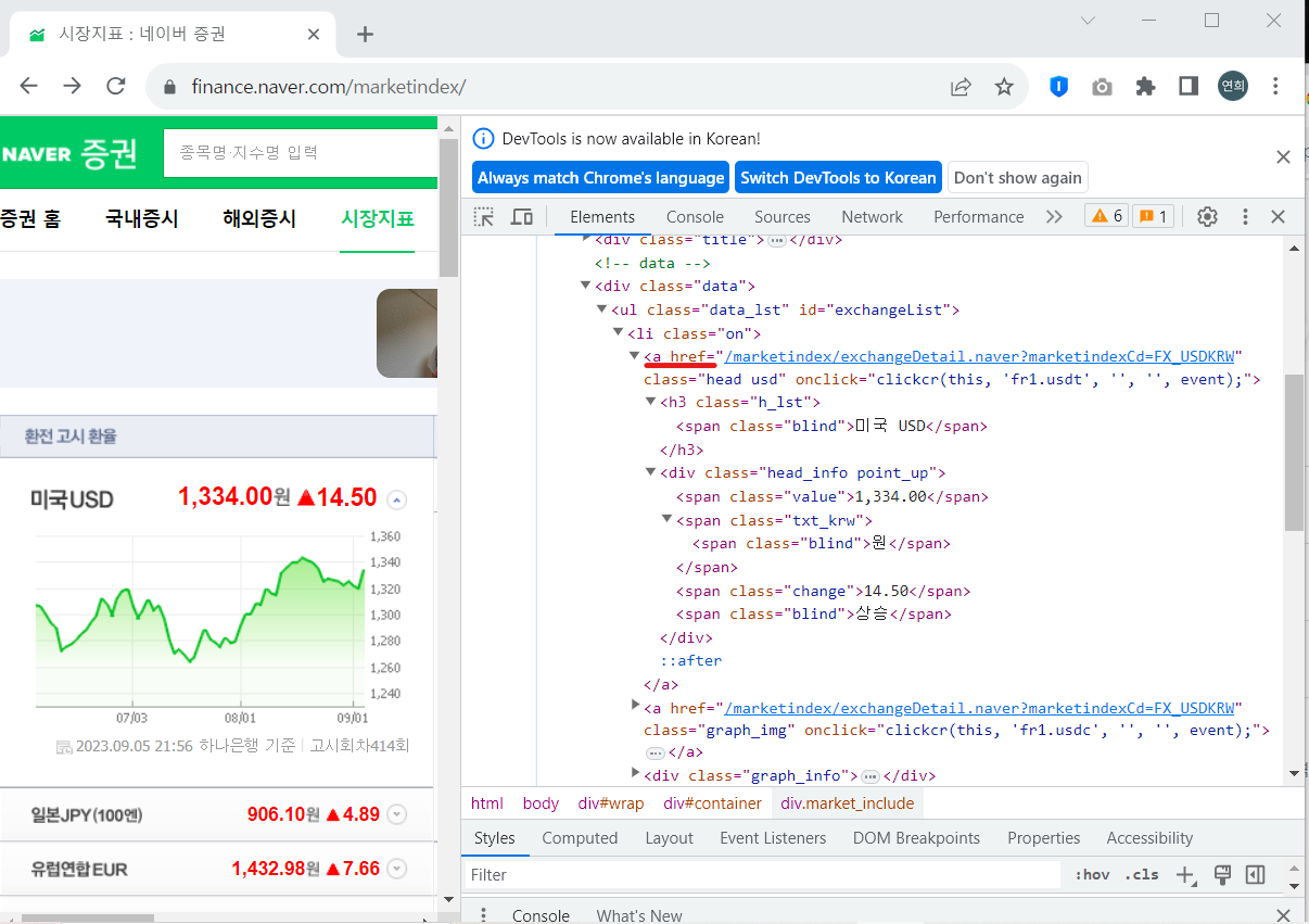 위 사진과 같은 환율 정보는 'li'태그에서 모두 찾을 수 있다.
