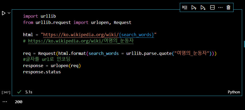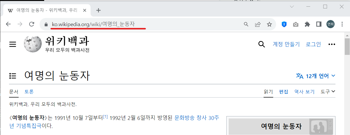 다음으로 위키백과에 '여명의 눈동자'를 검색해서 주요인물 정보를 가져오자. 먼저, url 정보를 불러와야 하는데, 주소가 한글이 섞여있기 때문에, 코드창에 붙여 넣으면 한글이 깨지게 된다.