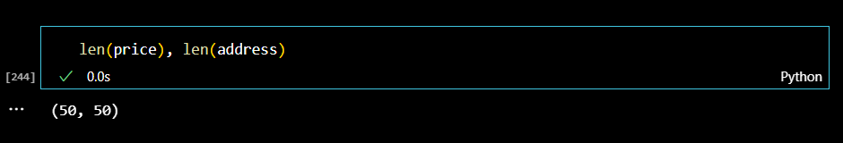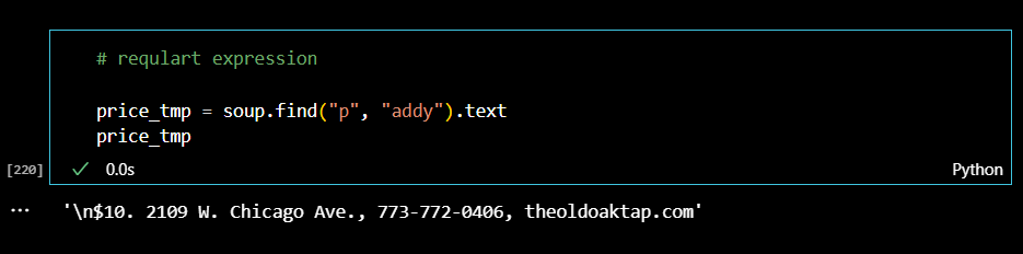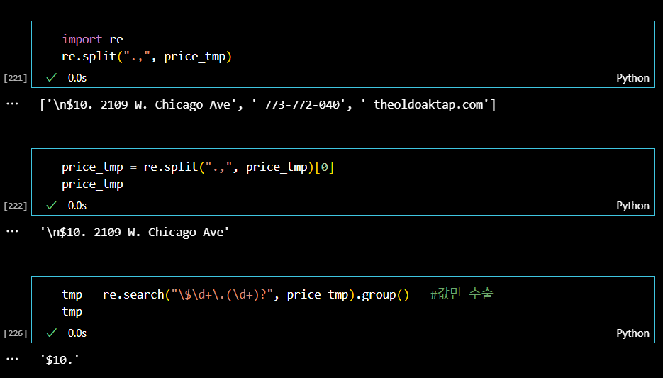 가격과 주소정보가 한꺼번에 있음을 확인했으므로, 리스트 형식으로 데이터를 구분해준다음 regular expression을 활용해서 원하는 정보만 출력해낸다.