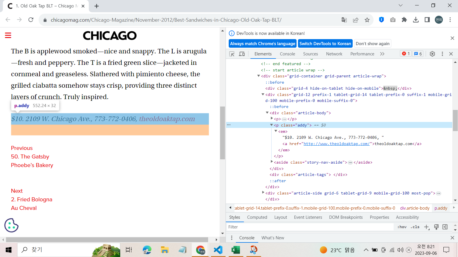 "p"태그의 class 속성값 "addy"에서 정보를 찾을 수 있었다.