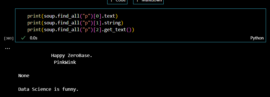 text 메서드 뿐만 아니라 다양한 메서드를 통해서 태그를 제외한 텍스트만을 추출할 수 있다. p태그를 찾아서 다양한 메서드로 인덱스 0,1,2의 데이터를 추출해보자.