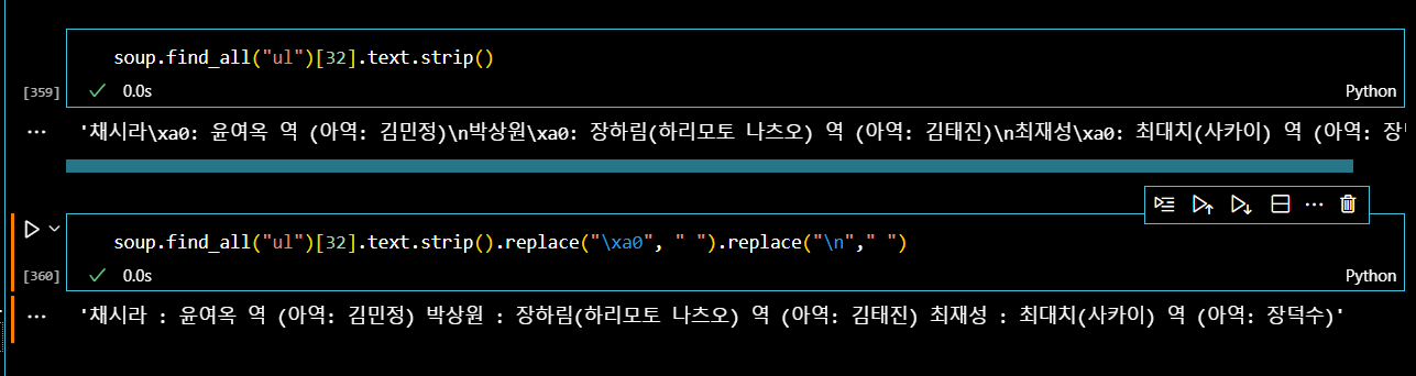 이제 인덱스 번호를 이용해서 데이터를 추출해보자. 같이 딸려오는 html코드는 strip()과 replace()를 이용해서 없애주었다.