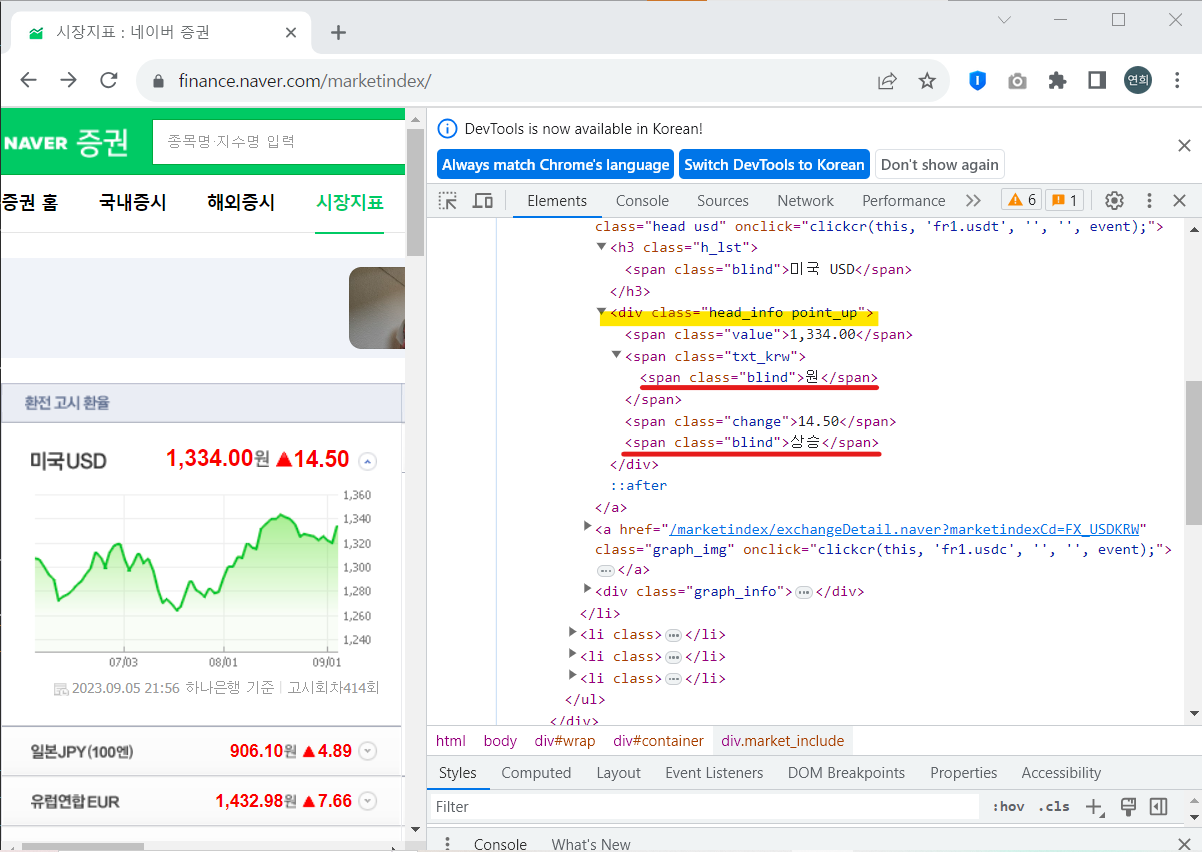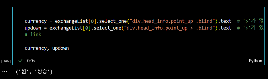 이제 환율 상승/하락 정보를 가져오자. 그런데 사진에서 보이는 것과 같이 속성값이 같은 것이 있다. 그래서 이럴 때에는 '>' 기호를 사용해서 그 밑의 태그를 출력한다는 표시를 해줘야 한다. 또한, 상위 클래스 속성이 'head_info point_up'으로 띄어쓰기로 되어있는데, 이는 띄어쓰기를 기준으로 두 개의 클래스가 붙어 있다고 보면 된다.