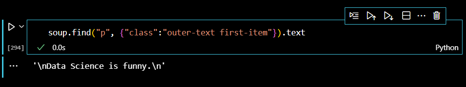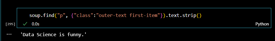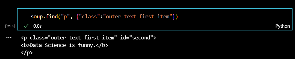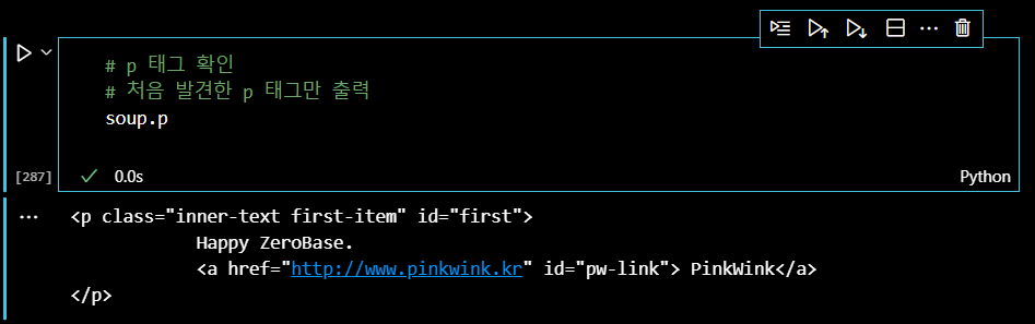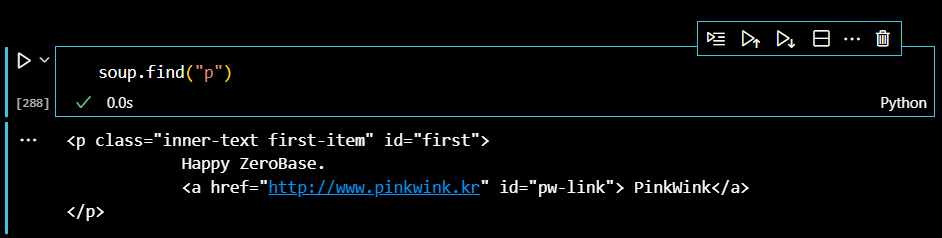 find()매서드 안에 태그뿐만 아니라, 태그 하위의 class나 id같은 속성값을 서술하여, 데이터를 추출할 수 있다. 먼저, find()로 첫 번째 p태그를 추출하면 다음과 같다.