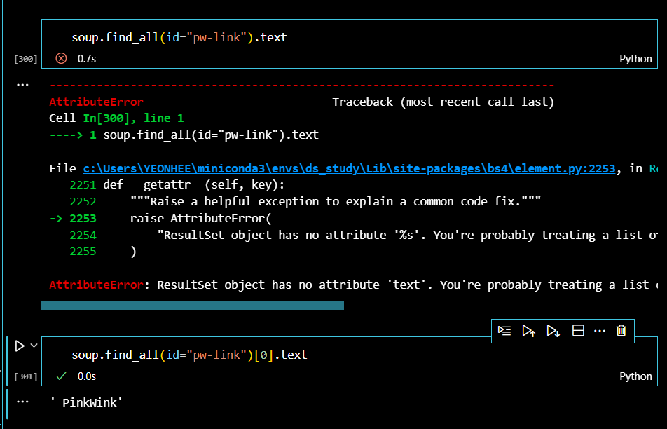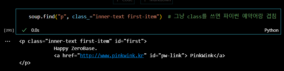 이때, class나 id속성 조건을 주어서 p태그를 찾아보자. 그런데 class는 python 예약어와 겹치기 때문에 조건을 줄 때에는 'class_='와 같은 형태로 적어야 한다.