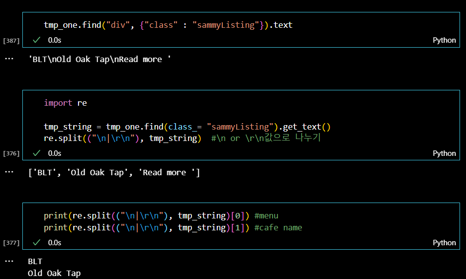 다음으로 메뉴 이름과 가게이름 정보이다. 두 정보는 하나의 클래스 속성값에 같이 저장되어 있으므로 인덱스 번호를 이용해서 값을 찾아주었다. 또한, 텍스트 메서드로 데이터를 찾았음에도 아직 붙어있는 html 코드는 벗겨주었다.