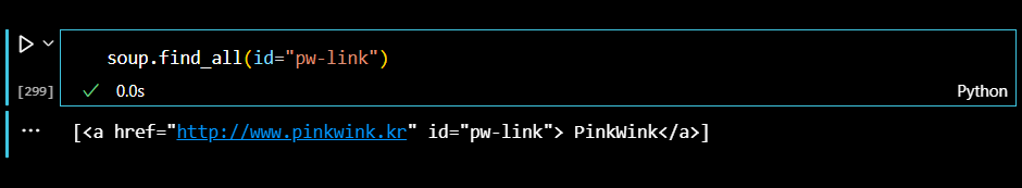 id 속성값으로도 데이터를 찾아보자. 혹시 여러 개를 찾을 수 있으니 find_all()매서드를 통해서 검색해보자. 이때 데이터 출력값은 리스트 형식으로 출력된다.