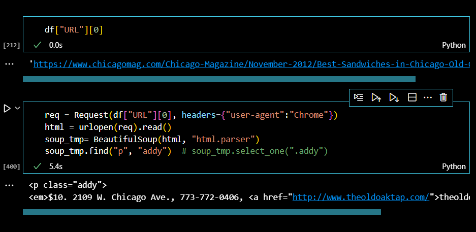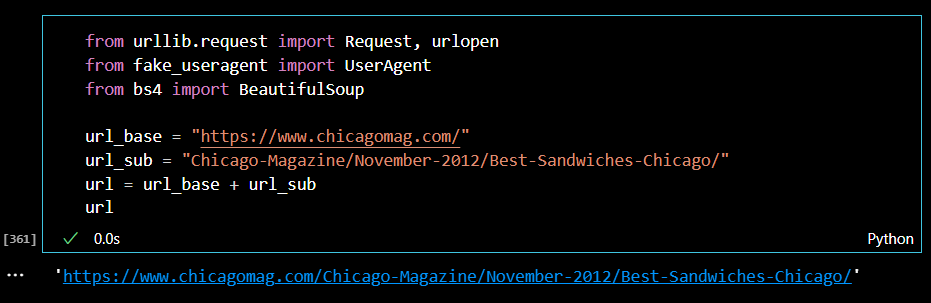 웹 크롤링은 BeautifulSoup 라이브러리를 이용하는데, 우선 몇 가지 예제를 통해서 사용방법을 익히고, <Chicago Magazine>에서 2012년에 발표한 'The 50 Best Sandwiches in Chicago' 데이터를 통해 웹데이터 분석을 해보자!