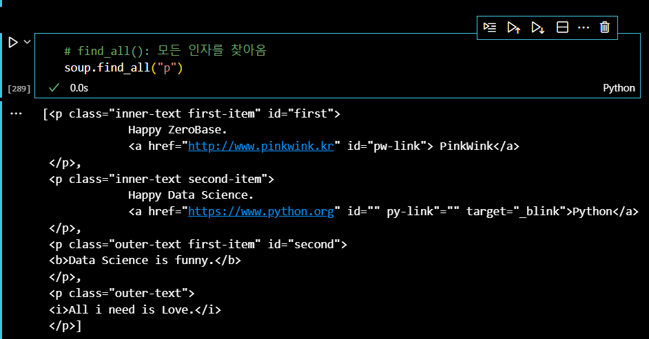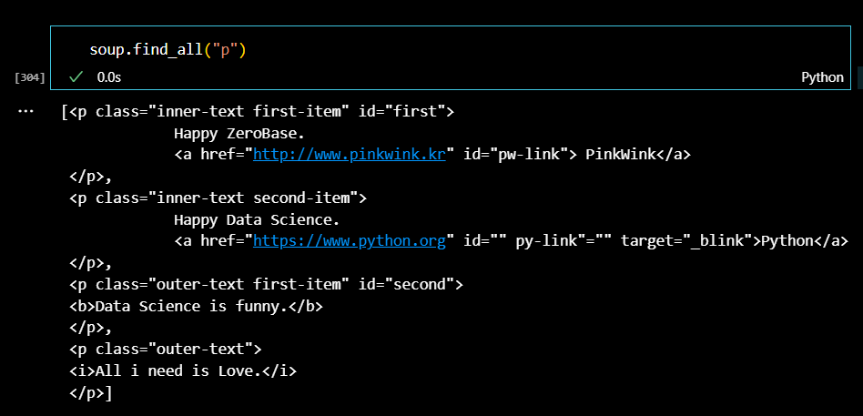 그런데 웹페이지의 p태그가 여러 개 있는데도 불구하고, 첫 번째 발견한 태그밖에 출력하지 못한다. 이럴때, find_all() 매서드를 사용하면 모든 태그를 찾을 수 있다. (단순 find() 매서드를 사용하면 태그 하나만 출력한다.) P태그를 모두 찾아보자.