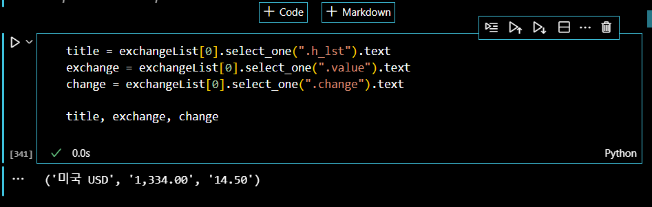 따라서 인덱스 0의 value가 미국 환율 정보가 된다. 먼저, 이를 이용해서 국가명, 환율 금액, 변동 금액을 출력해보자. 각각의 class 속성값을 이용한다. slect() 메서드를 사용할때 class나 id를 기호로 간단하게 표현할 수 있는데, class의 경우에는 아래 코드와 같이 '.'으로, id의 경우에는 '#'으로 간단하게 사용할 수 있다.