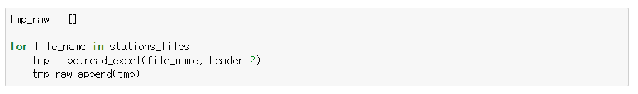 이제 데이터프레임으로 만들어주자. 25개 엑셀표 모두 형식이 동일했기 때문에, 연달아 붙이기만 하면 된다. 이런 경우에는 concat 메서드를 사용하면 간단하게 이어붙일 수 있다.