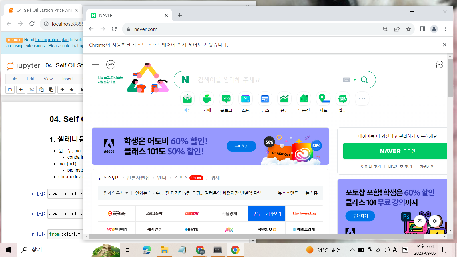 내가 작업하고 있는 Jupyter notebook이 적용되고 있는 크롬 브라우저말고 하나의 창이 열린 것을 볼 수 있다. 이렇게 열린 창은 URL주소창 아래에 'Chrome이 자동화된 테스트 소프트웨어에 의해 제어되고 있습니다.' 라는 문구가 적혀있다. 작업이 마쳤으면