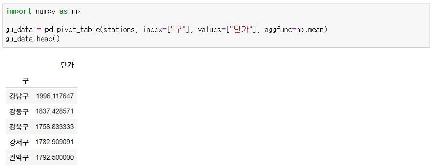 따로 '자치구별 휘발유 평균단가'의 pivot table을 만들어 주었다.