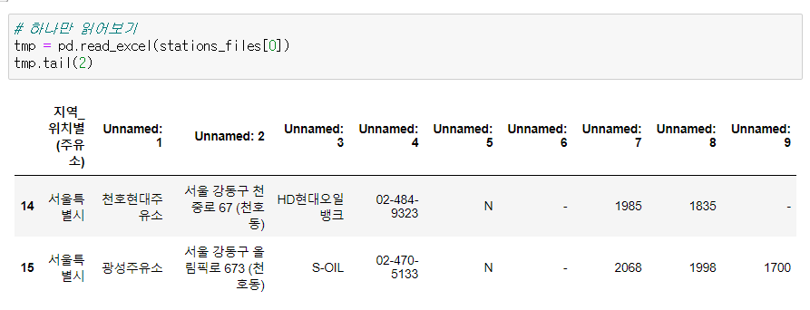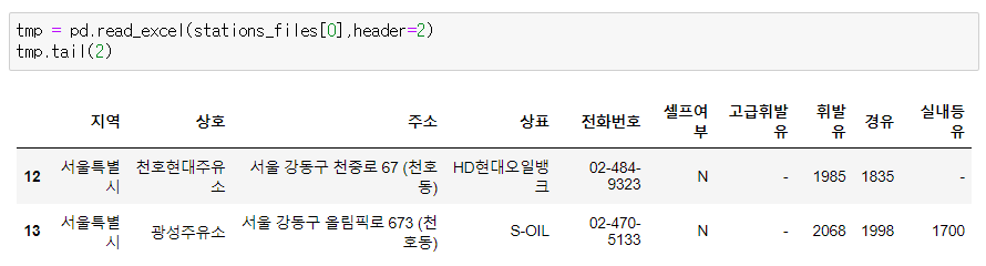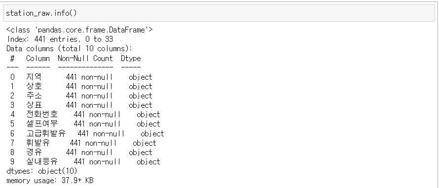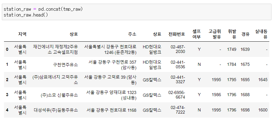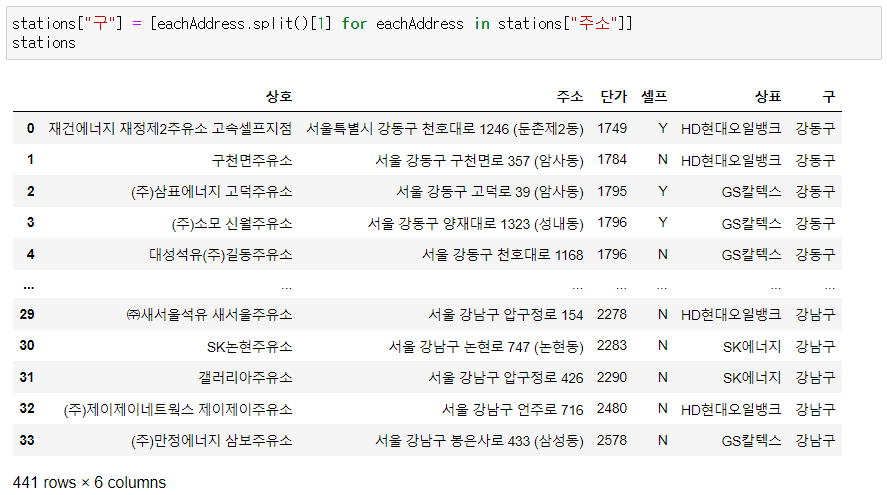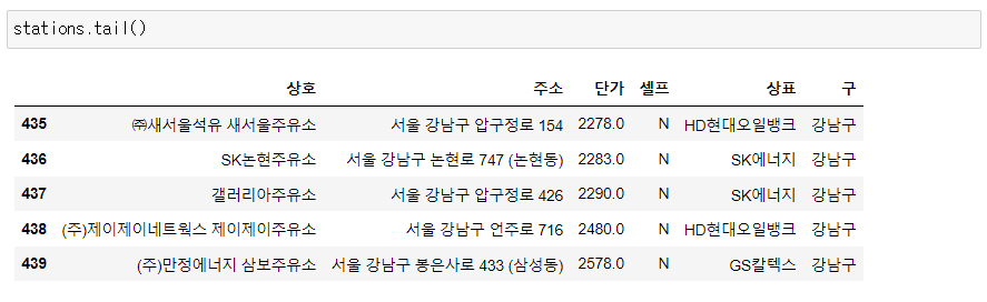 모두 441개의 주유소 데이터가 수집되었음을 확인하였다.