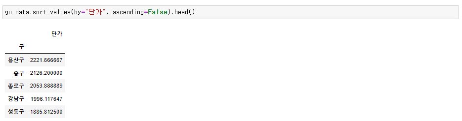 '단가'별로 내림차순했더니 용산구, 중구, 종로구, 강남구, 성동구 순으로 휘발유 평균 단가가 높음을 확인했다.
