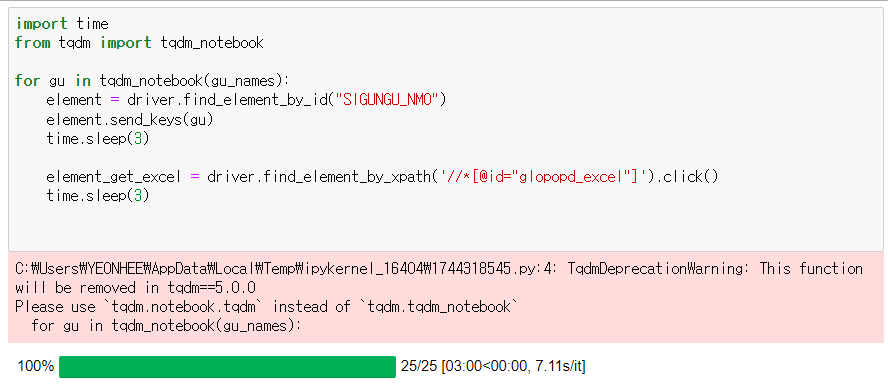 이때, selenium가 시간을 갖고 차근차근 진행될 수 있도록, 3초간의 휴지기를 두고서 자치구 선택 -> 엑섹버튼 누르기 과정을 진행할 수 있게 하였다.