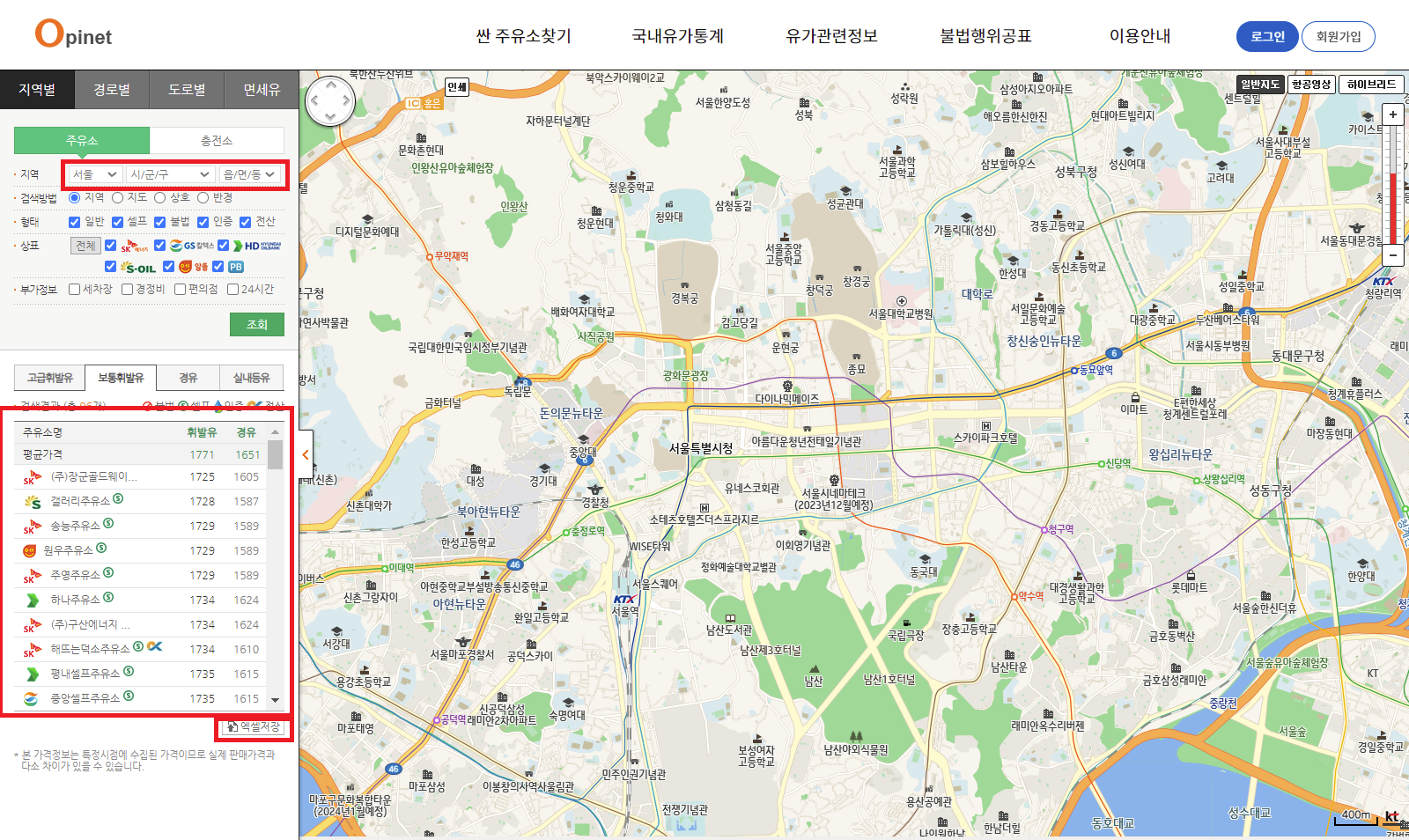 그렇다면 이제부터 '오피넷' 홈페이지를 통해서 서울시 자치구 주유소들의 가격을 비교해 보자. 프로젝트의 핵심 목표는 '정말 셀프주유소 가격이 더 저렴한가'를 확인하는 일이며, 더 나아가 자치구들의 주유소의 가격을 비교하고, 지도 시각화까지 해보는 것이다.