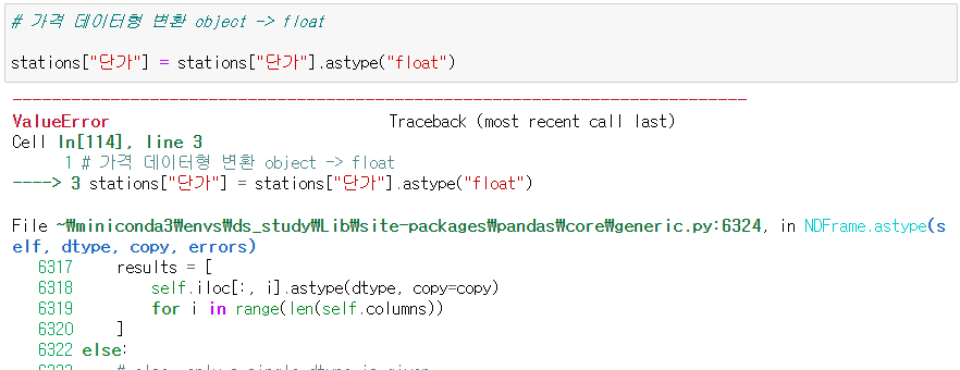 다음으로 '단가'컬럼의 데이터가 object형으로 되어 있는 것을 'float'형으로 바꿔주자.