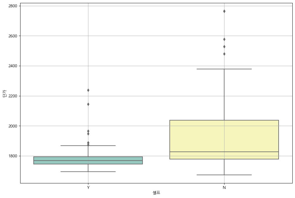 sns.boxplot(x="셀프", y="단가", data=stations, palette="Set3")