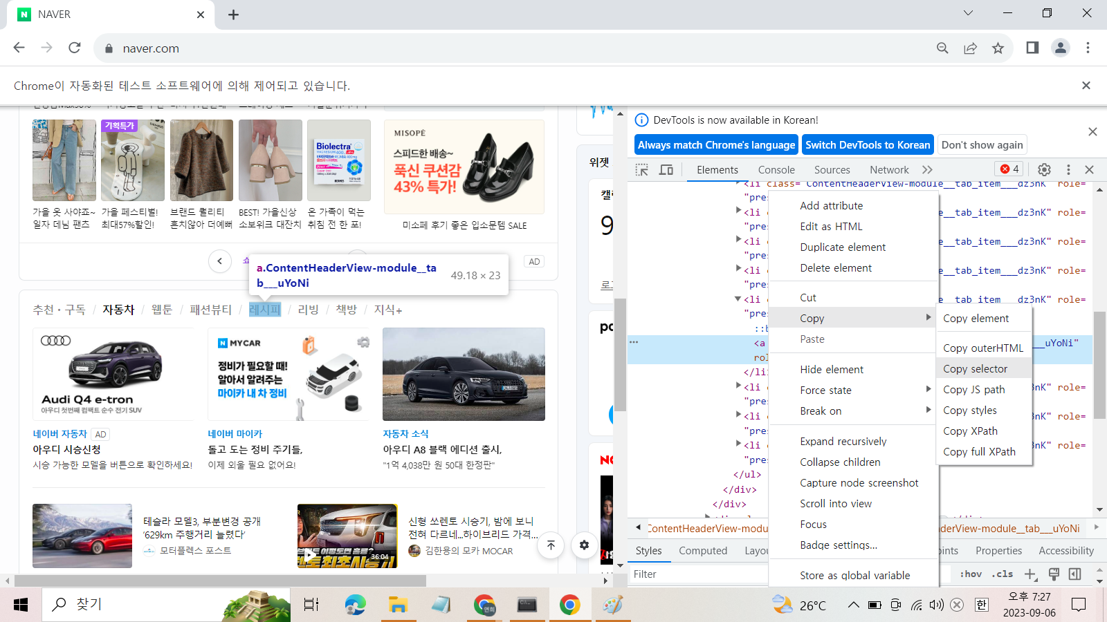 우선 ActionChains 모듈을 불러온 다음find_element()메서드를 이용하는데, Selenium에서 제공하는 기본 By클래스를 이용한다. 아래 사진에서 처럼 원하는 코드를 'copy selector'한 다음 붙여넣어준다.