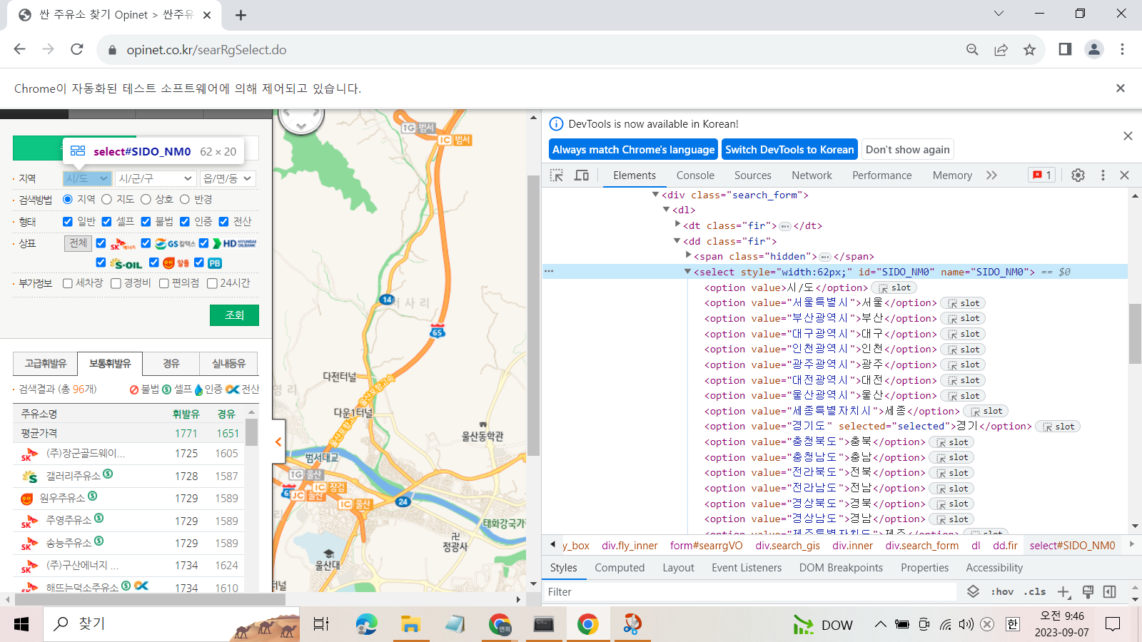 사실 강의 날짜 기준으로는 메인페이지와 지역별 휘발유 단가를 확인하는 하위 페이지의 URL주소가 같아서 이를 원격으로 이동해주는 작업이 필요했지만, 지금은 이미 URL주소가 구분되어서 그런 작업의 수고를 덜게 되었다.