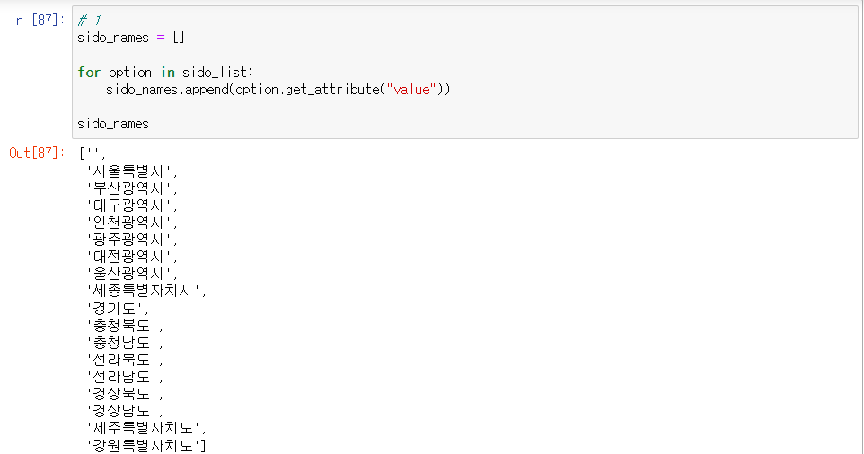 각 시도명은 자식 태그안의 <option value> 안에 있다는 것이 보인다. 이를 이용해서 속성값 데이터를 가져오자.