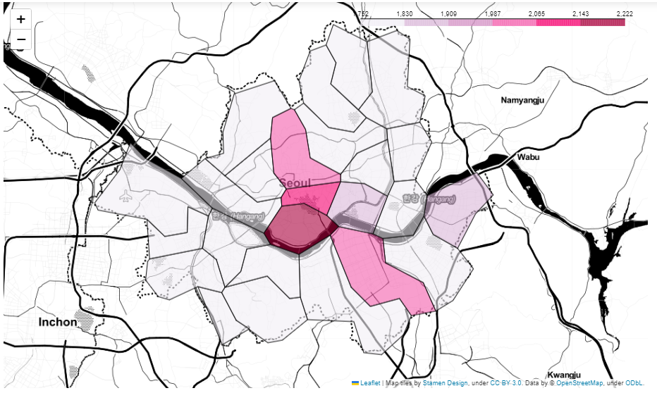 지도로 확인하니, 역시나 용산구의 단가가 제일 높다. 6개의 자치구의 평균 단가가 높다는 것을 확인할 수 있고, 나머지 자치구들은 대략적으로 비슷해 보인다.