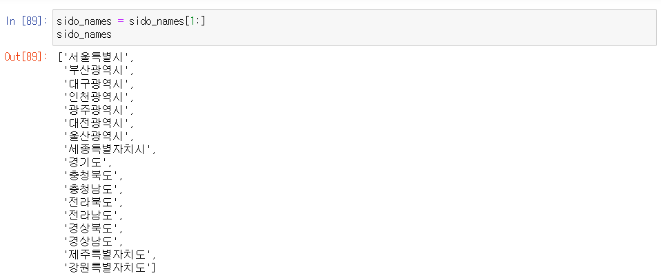 다음과 같이 17개의 시도명을 리스트 형식으로 변수에 지정했다.