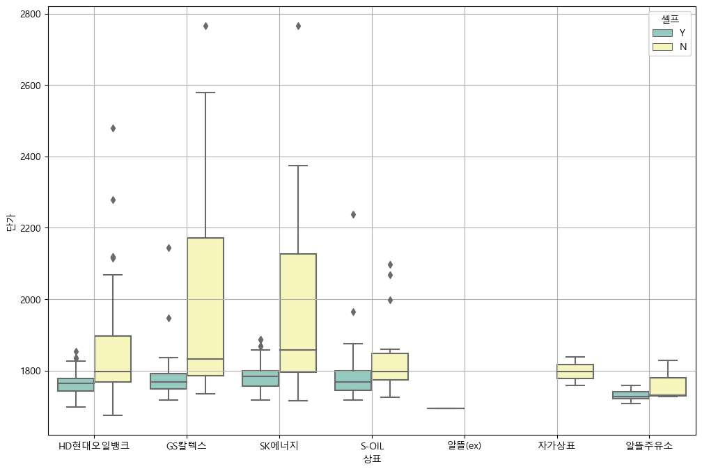 그렇다면, 주유소 상표별로 나뉘었을 때에도 차이가 날까?
