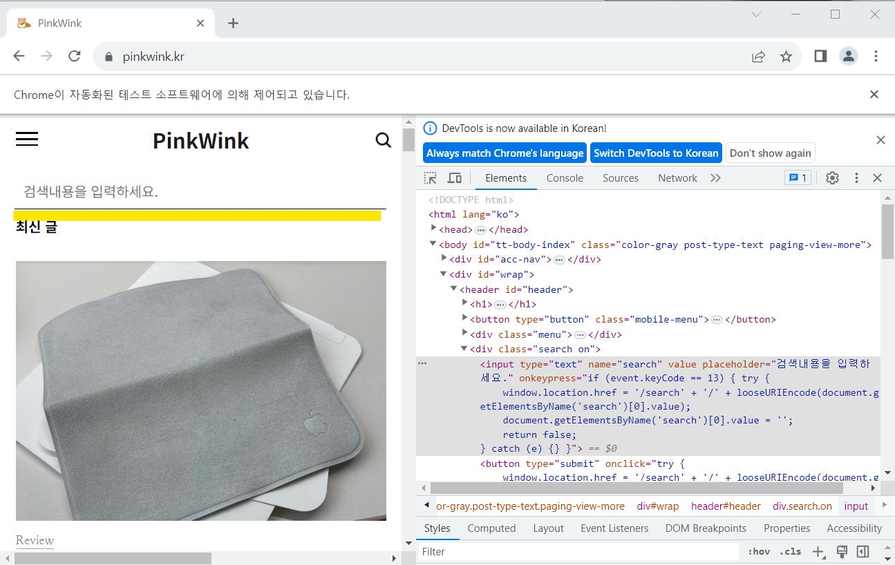 이전 드라이버를 종료해주고, 새로운 URL주소('https://pinkwink.kr')로 들어가서 검색어를 입력해보자.