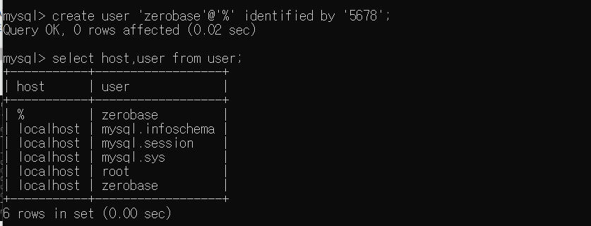 CREATE USER 'zerobase'@'%' identified by '5678';